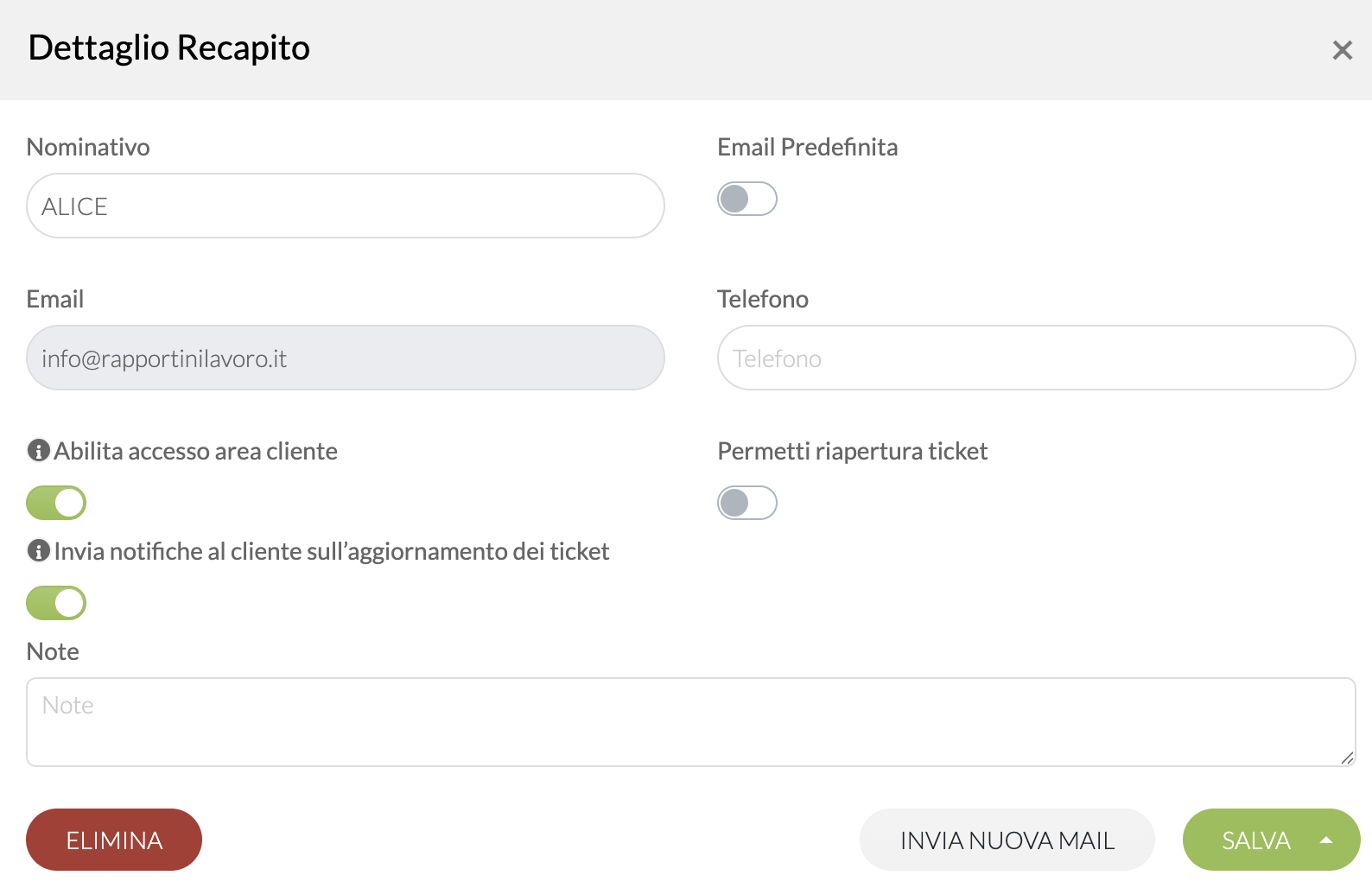 Una volta cliccato su SALVA il recapito verrà salvato all’interno dell’anagrafica cliente.