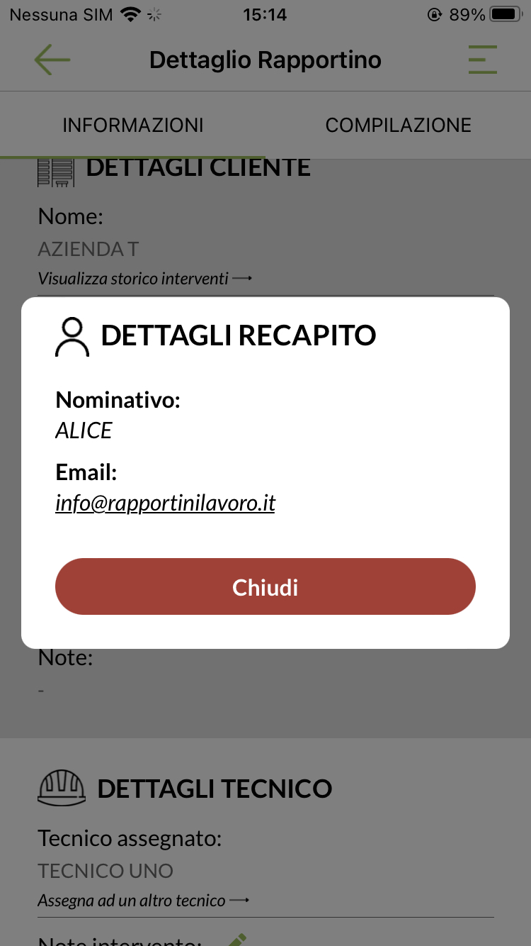 Il tecnico da applicazione potrà consultare tutti i recapiti all’interno della sezione INFORMAZIONI del rapportino associato al cliente