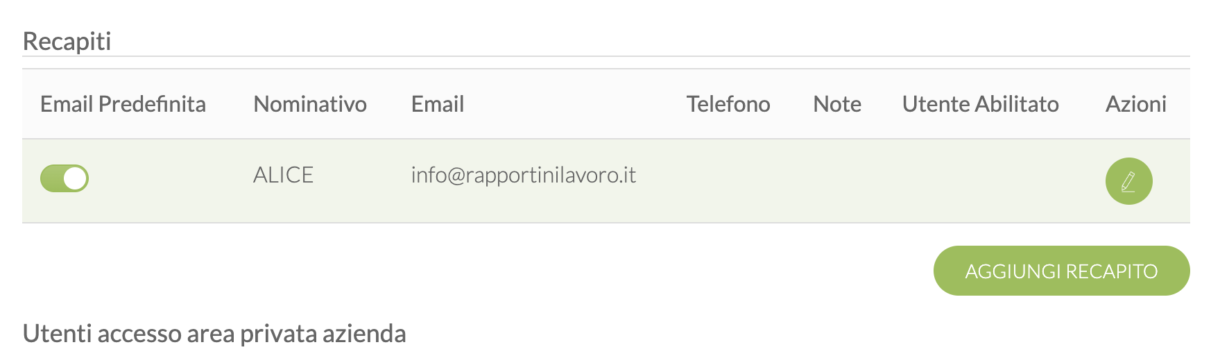 Possono essere inseriti manualmente direttamente in questa sezione, cliccando su “AGGIUNGI RECAPITO”.